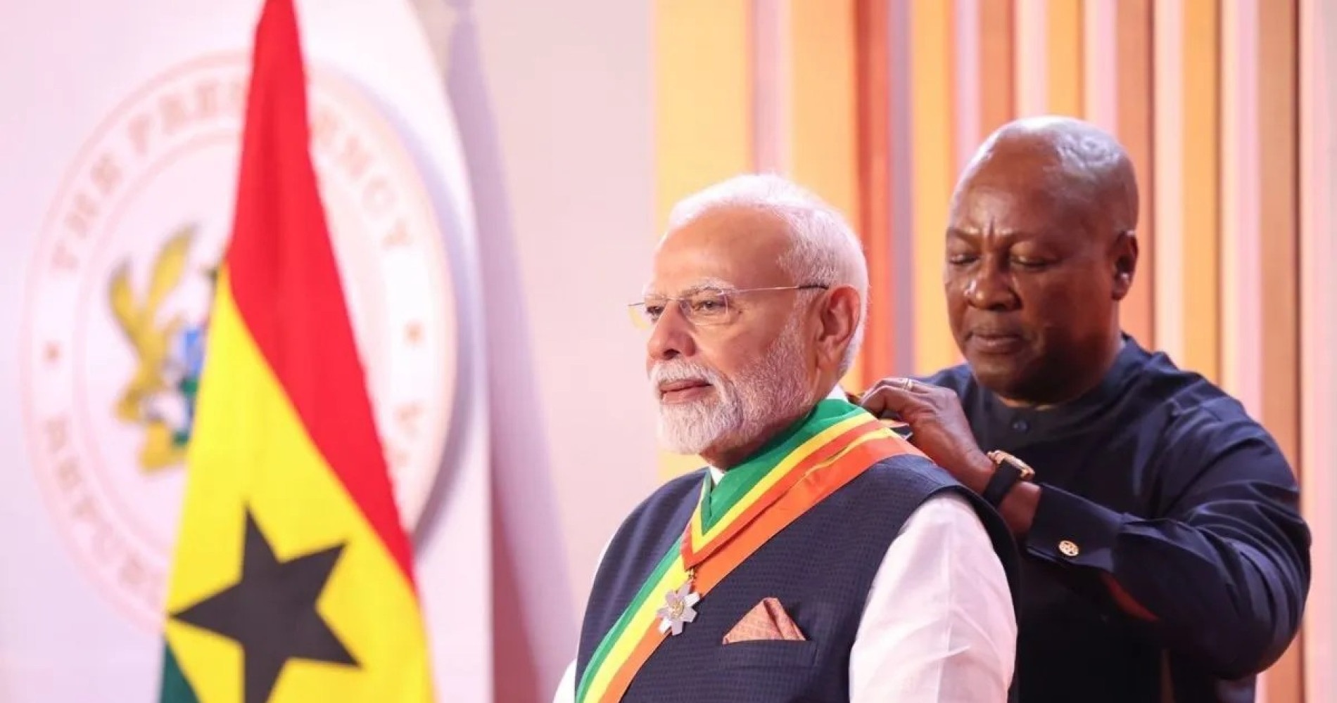घाना के राष्ट्रपति जॉन महामा द्वारा सर्वोच्च सम्मान से सम्मानित किए जाने पर पीएम मोदी ने कहा, यह मेरे लिए गर्व की बात है। मोदी ने कहा कि भारत और घाना आतंकवाद को मानवता का दुश्मन मानते हैं। दोनों देश इसके खिलाफ मिलकर काम करेंगे। घाना में पीएम मोदी ने कहा कि यह युद्ध का समय नहीं है। बातचीत और कूटनीति के जरिए समस्याओं का हल होना चाहिए। दोनों देश संयुक्त राष्ट्र में सुधारों पर एकमत हैं। दोनों देशों ने पश्चिम एशिया और यूरोप में चल रहे संघर्ष पर चिंता जताई है।